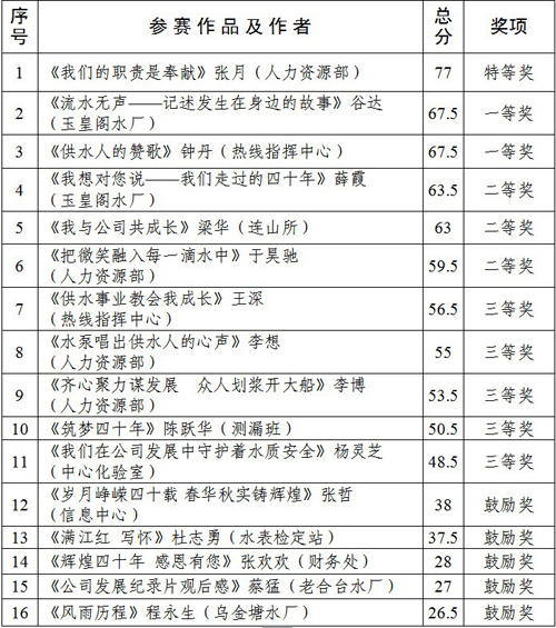 今年是自來水公司成立四十周年,為追尋企業(yè)四十年改革發(fā)展壯大的歷史軌跡,公司于今年8月份開展了“慶祝公司成立四十周年”征文比賽活動。機(jī)關(guān)及各基層單位高度重視此次活動,干部職工熱情參與,立足本職崗位積極撰寫征文,作品充分展現(xiàn)了供水人四十年來艱苦奮斗、開拓創(chuàng)新、無私奉獻(xiàn)的精神風(fēng)貌,活動開展以來,共收到征文作品16篇。