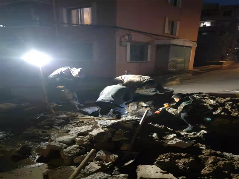 11月17日,宏業(yè)小街區(qū)域出現(xiàn)漏點。營業(yè)三分公司維修人員趕到現(xiàn)場后發(fā)現(xiàn),該區(qū)域地處坡路,屬于商混路面,地面厚,而且還在供暖管下方,測漏人員很難定準漏點,要把整個路面破開才能找到漏點。由于開裂處地理位置特殊,打電鎬難度大,給施工造成困難。搶修人員相互配合,輪換跳入滿是積水的泥坑進行搶修作業(yè)。刺骨的冰水浸透了衣服,泥水沒過膝蓋,他們顧不上嚴寒的侵襲,一刻也不放松搶修的進度。大家堅守在搶修第一線。餓了,啃幾口干糧;困了,就輪流打個盹,爬起來繼續(xù)干??恐@種工作態(tài)度,大家從下午3點開始,經(jīng)過9個多小時持續(xù)不間斷奮戰(zhàn),漏點修復,到晚上近11點才維修完畢,恢復供水!