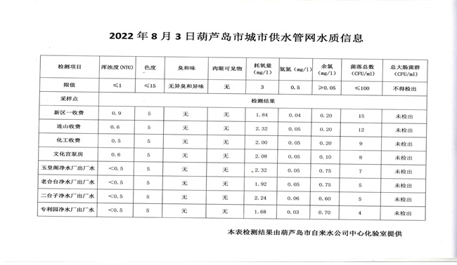 2022年8月3日葫蘆島市城市供水管網(wǎng)水質(zhì)信息