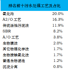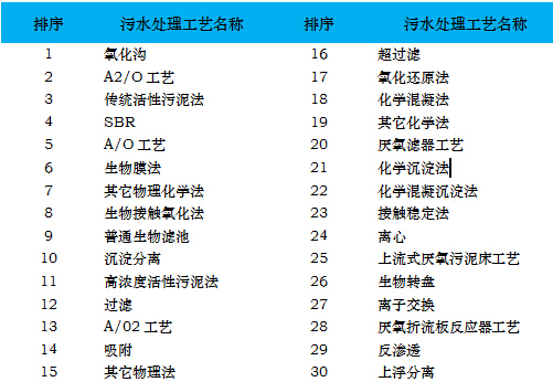 據(jù)不完全統(tǒng)計(jì),全國(guó)范圍內(nèi)已建成運(yùn)營(yíng)的污水處理廠數(shù)量約4000座,這其中有統(tǒng)計(jì)數(shù)據(jù)的污水處理工藝大約30種左右,E20研究院統(tǒng)計(jì)各類(lèi)技術(shù)工藝,排名如下文所示: