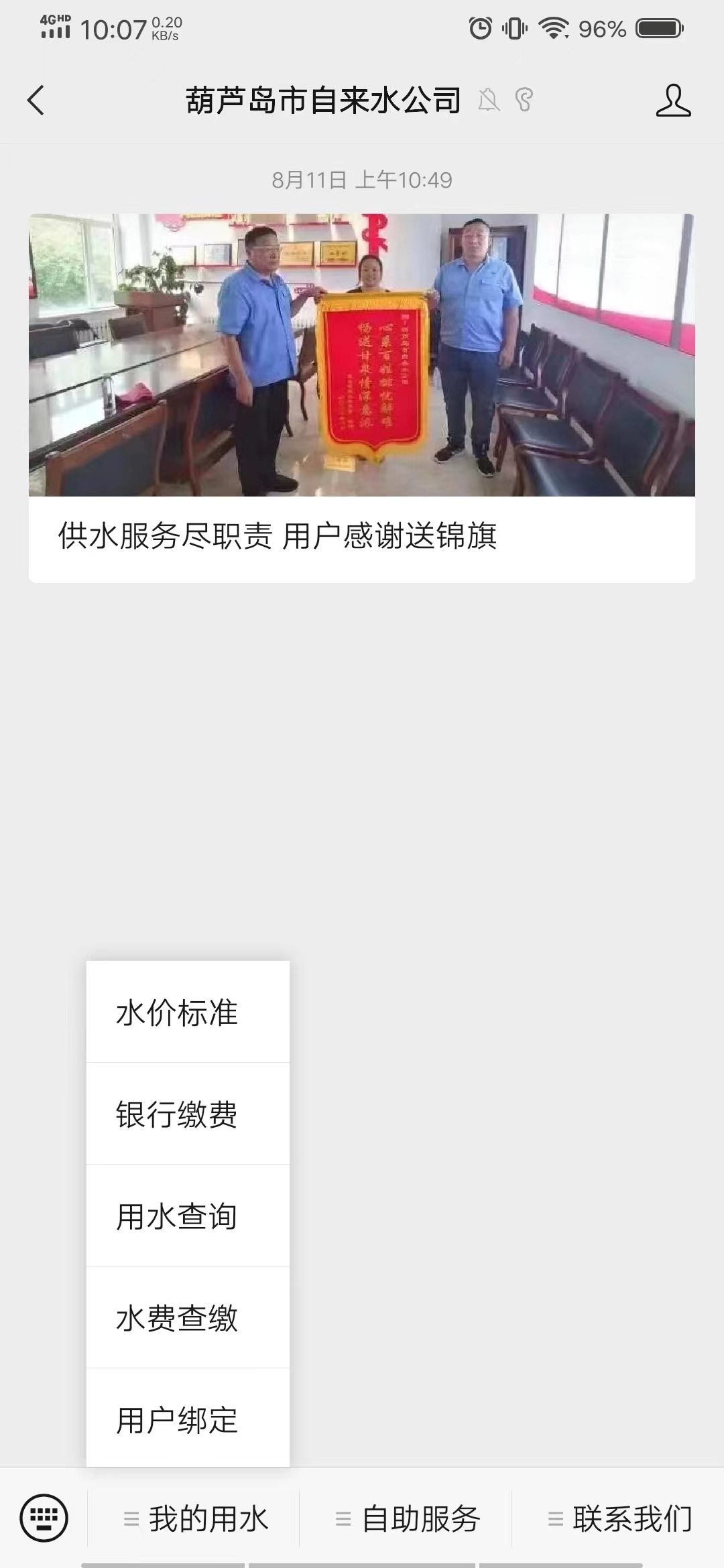進(jìn)入葫蘆島市自來水公司公眾號—點擊我的用水—點擊水費(fèi)查繳
