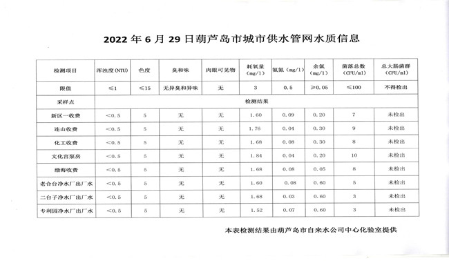 2022年6月29日葫蘆島市城市供水管網(wǎng)水質(zhì)信息