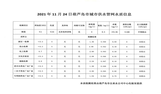 2021年11月24日葫蘆島市城市供水管網(wǎng)水質(zhì)信息