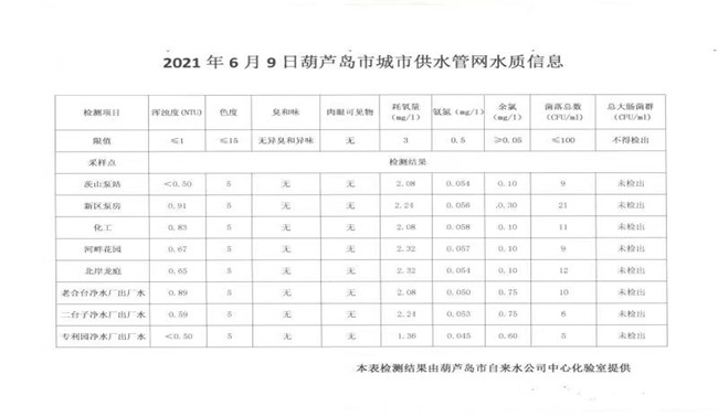 2021年6月9日葫蘆島市城市供水管網(wǎng)水質(zhì)信息