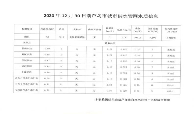 2020年12月30日葫蘆島市城市供水管網(wǎng)水質(zhì)信息