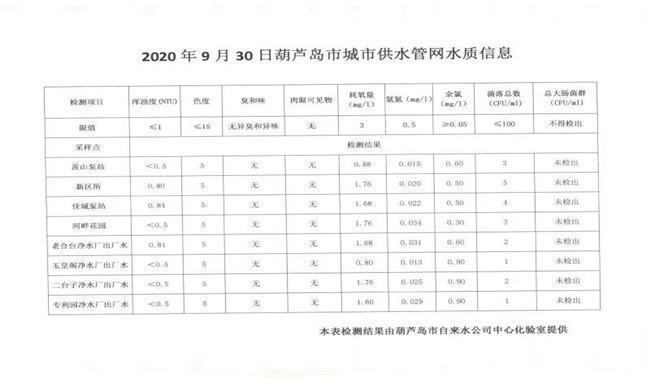 2020年9月30日葫蘆島市城市供水管網水質信息