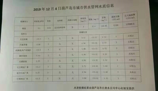 2019年12月4日葫蘆島市城市供水管網(wǎng)水質(zhì)信息
