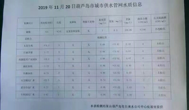 2019年11月20日葫蘆島市城市供水管網水質信息