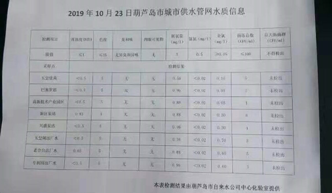 2019年10月23日葫蘆島市城市供水管網(wǎng)水質(zhì)信息