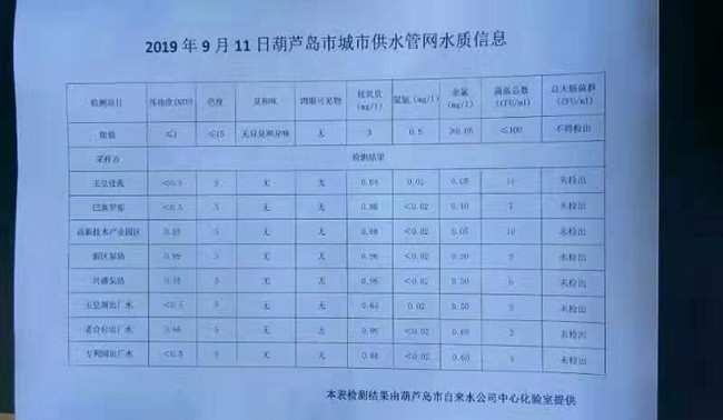 2019年9月11日葫蘆島市城市供水管網水質信息