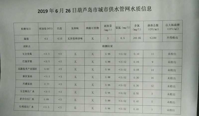 2019年6月26日葫蘆島市城市供水管網(wǎng)水質(zhì)信息