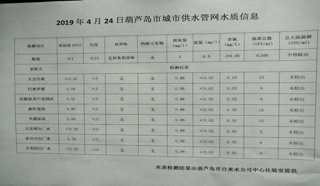 2019年4月24日葫蘆島市城市供水管網(wǎng)水質(zhì)信息