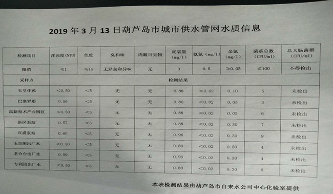 2019年3月13日葫蘆島市城市供水管網(wǎng)水質(zhì)信息