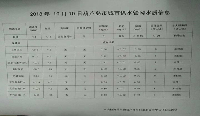 2018年10月10日葫蘆島市城市供水管網(wǎng)水質(zhì)信息