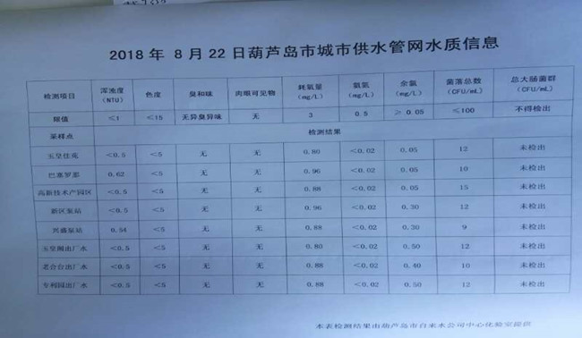 2018年8月22日葫蘆島市城市供水管網水質信息