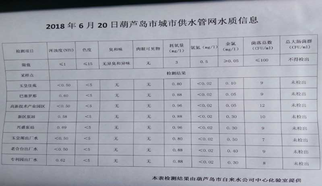 2018年6月20日葫蘆島市城市供水管網(wǎng)水質(zhì)信息