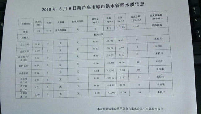 2018年5月3日 9日 16日 葫蘆島市城市供水管網(wǎng)水質(zhì)信息