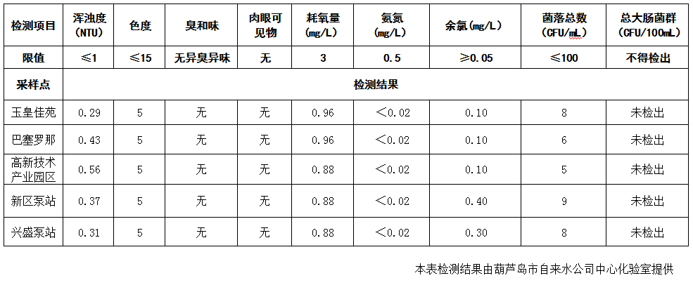 2017年8月30日葫蘆島市城市供水管網(wǎng)水質(zhì)信息